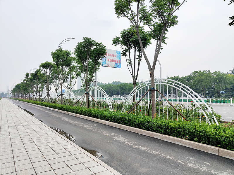 该项目是潍坊高新区本年度重点工程,工期紧任务重,且处于交通要道,施工限制条件多。园林公司高度重视,选派施工经验丰富,管理能力强的项目管理团队,按照“策划先行,样板引路,工序报验,一次成优,创园林精品工程”的指导方针,统筹兼顾安全、环保、质量、工期等要素,分步推进,分层实施。在充分理解设计意图的基础上,采用上层乔木(国槐、造型景松、丛生五角枫等)、中层灌木(山桃、木槿、紫薇等),丛植或群式种植的乔灌木,同种或不同种苗木高低错落,充分体现自然生长的特点;底层地被草坪及月季模纹等,边缘轮廓线、平面线形流畅,外缘成弧形,高低层次分明,主次分区明显,入界合理,合于自然;此外再结合花期、花色、观果及景观置石等体验搭配布置,以园路广场为纽带,连线成面,最终形成鸢城花海和枫林绿道两大景观群,展示了大气疏朗的四季门户景观效果。